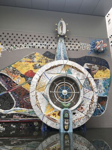 大阪は、堺筋と本町通りの南西角にあった重厚な茶色のビル、本町ビルディングが建て替わり、「大阪商工信用金庫新本店ビル」となる 本町ビルディングの屋上にあった彫刻は、今井兼次さんという方の“フェニックス・モザイクレリーフ「糸車の幻想」”という彫刻…